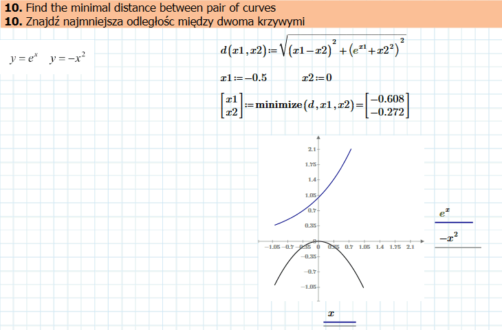 Najmniejsza odległość między dwoma krzywymi (funkcjami). Tu mamy tylko dwie zmienne niezależne, na przykład współrzędne x punktów na krzywych. Współrzędne y wyznaczamy z odpowiednich funkcji.